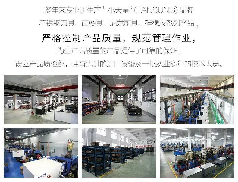 小天星专注厨房用品行业24年,企业拥有自己模具开发团队和产品设计团队,现拥有多项国家发明专利、实用新型和外观专利,给予消费者更多更好的优质产品体验。公司注重工厂现代化管理,严格执行6s管理,保证每个车间清洁,整理,安全。在小天星集团数十年机械领域的强大支撑下,塑料生产线基本实现机械手自动生产,为进一步提高生产效率,公司引进高速注塑机械和自动供料管道系统,在降低员工劳动强度的同时,大幅提高产品质量和生产效率。产品安全是企业对消费者最基本的承诺,为了提高产品的质量,小天星公司还建立了硅胶净化车间和注塑无尘车间,生产的接触食品类产品已通过QS认证,公司坚持科学技术是第一生产力,设立有专职的技术骨干和研发团队,整体实力已经达到行业领先水平。